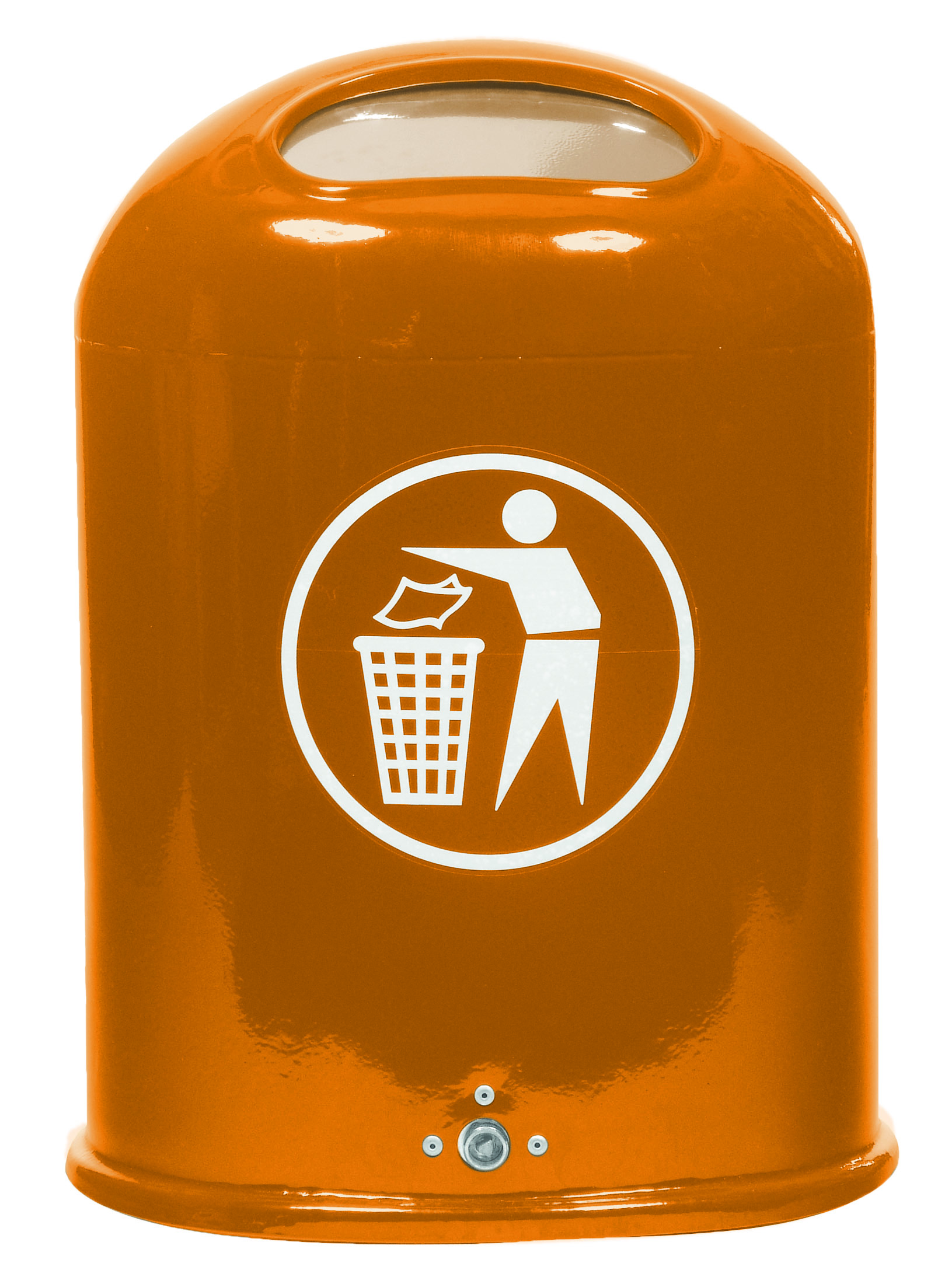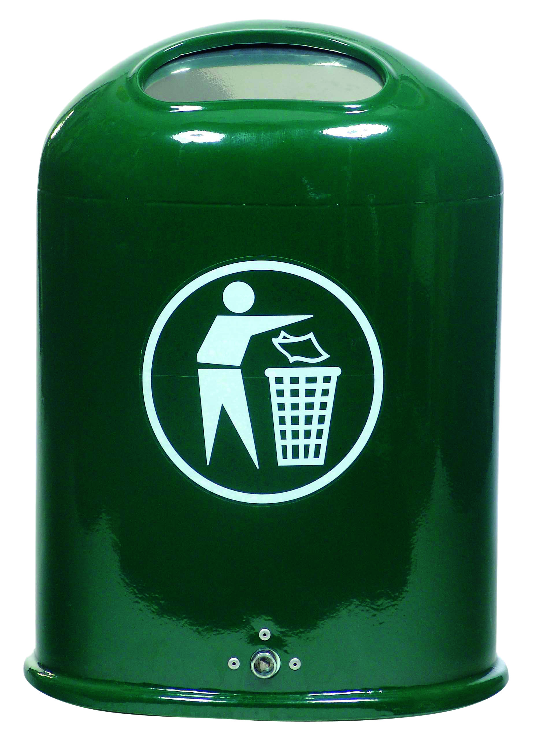 Ovaler Abfallbehälter mit Bodenentleerung und selbstschließender Federklappe im Einwurf