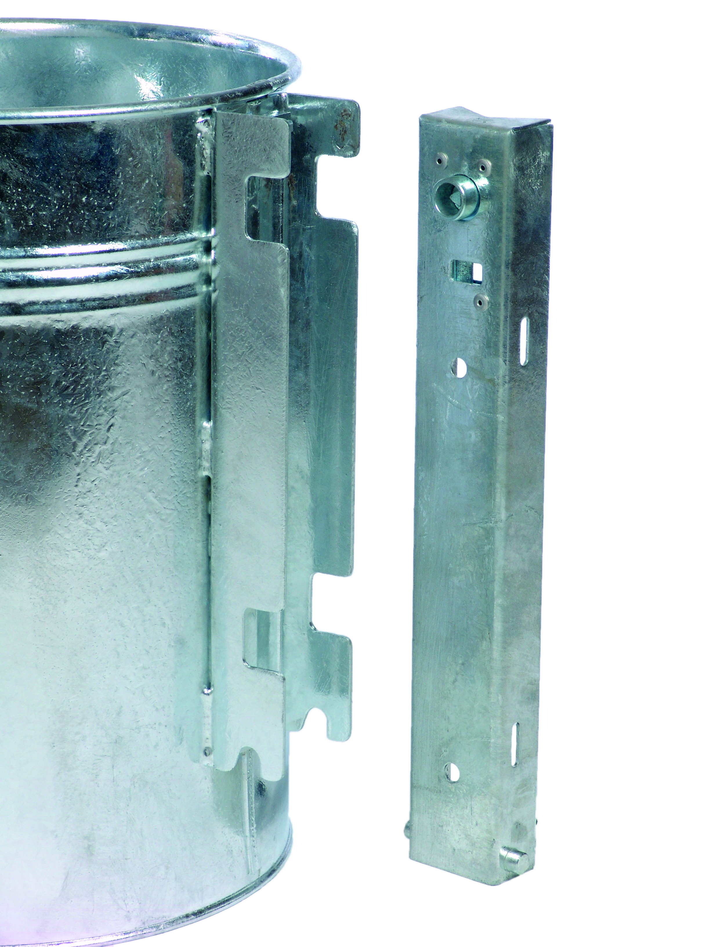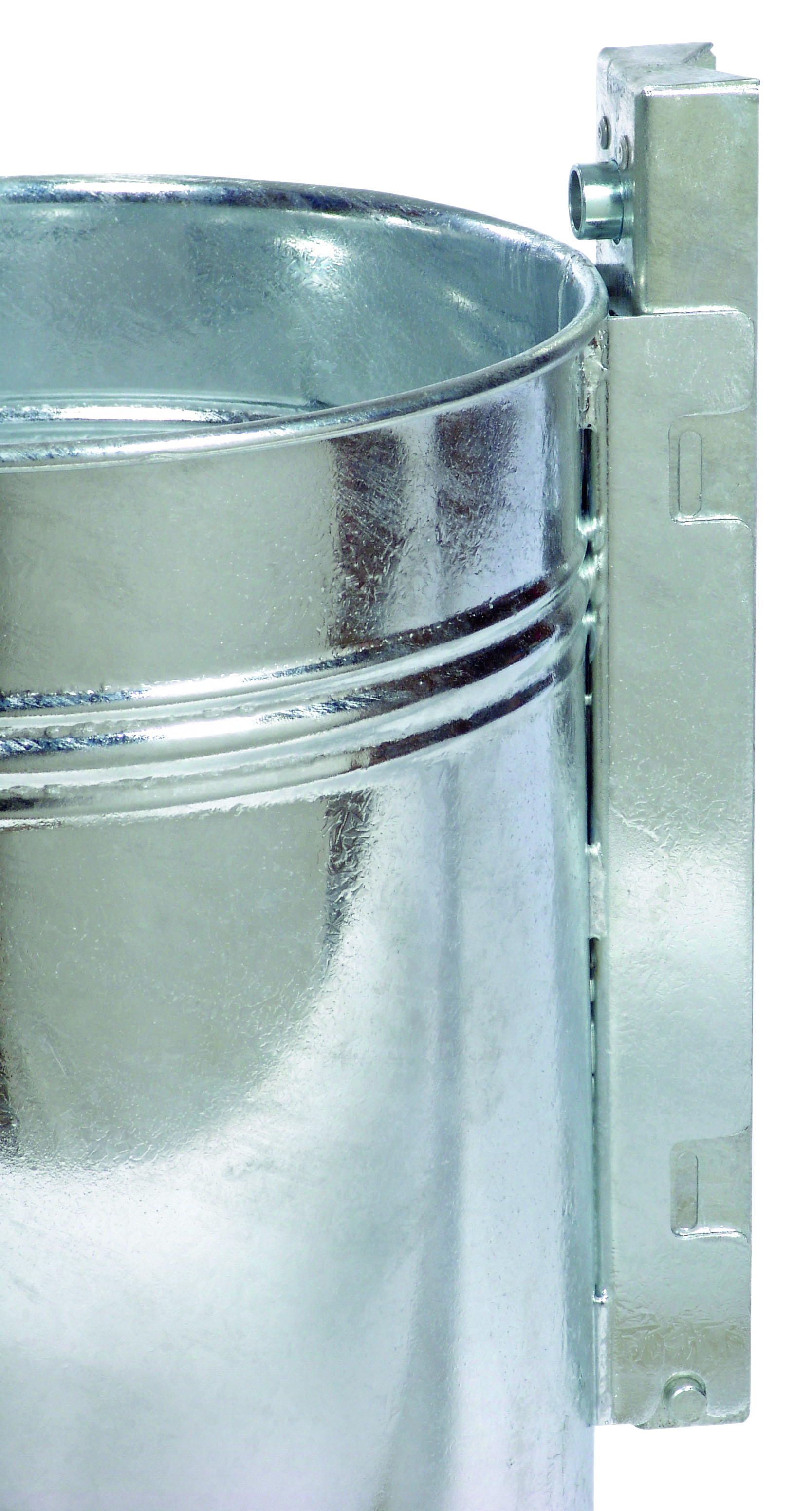 • offener Rund-Abfallbehälter mit einer Wandstärke von t=1,5 mm und einem angeschweißten Verstärkungsprofil zum Schutz von Raster und Befestigungsschiene