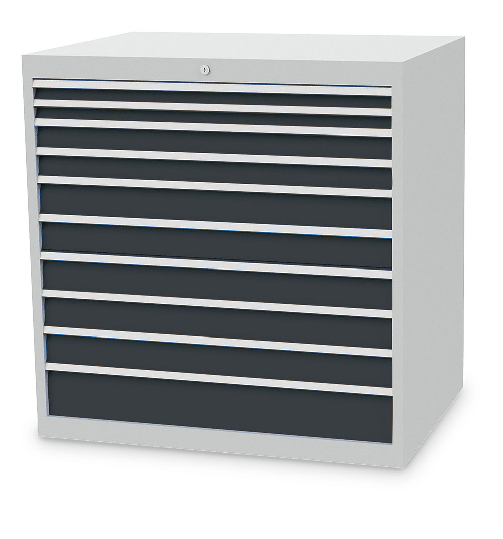 Dieser Schubladenschrank ist echt made in Germany. Stabiles Gehäuse aus verschweißtem Stahlblech. 10 x Schubladen mit Vollauszug 100%. Erhöhte Kippsicherheit durch Schubladen-Einzelauszug, nur eine Schublade kann geöffnet werden. Sichere Zentralverriegelung, diebstahlsicher.