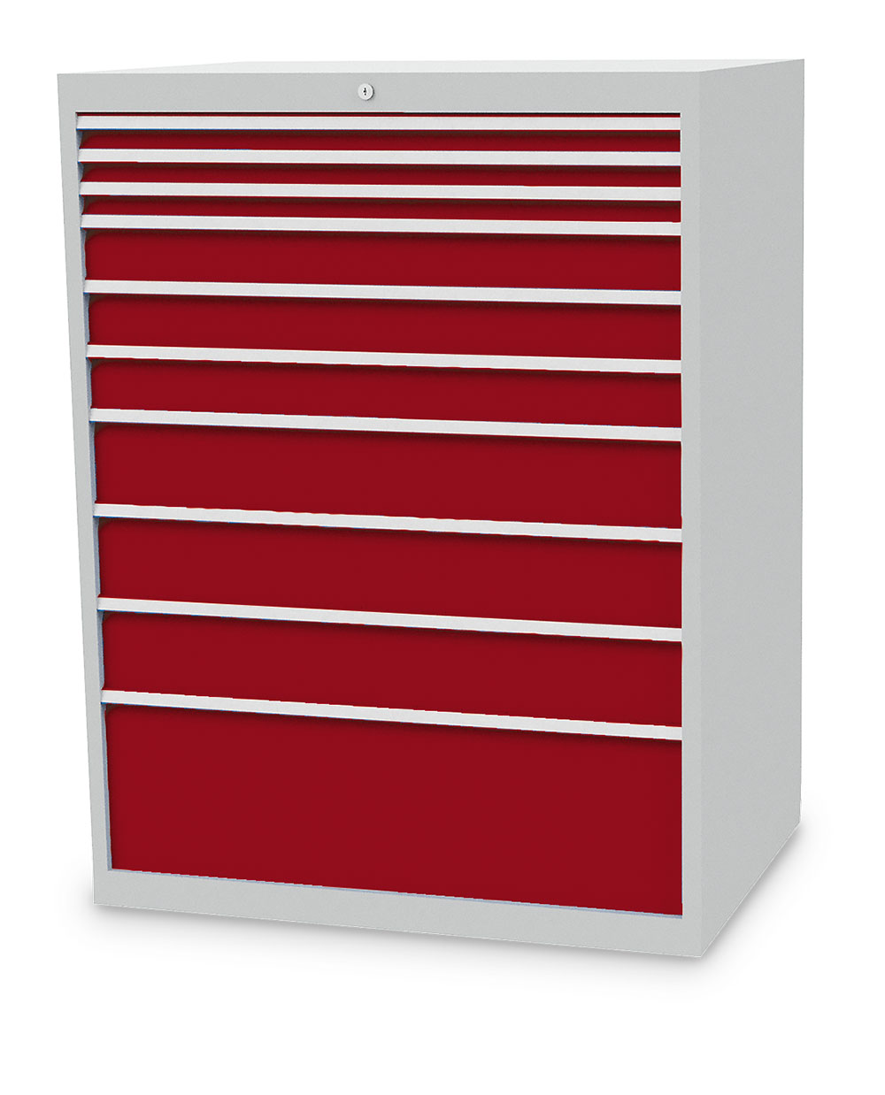 Dieser Schubladenschrank ist echt made in Germany. Stabiles Gehäuse aus verschweißtem Stahlblech. 10 x Schubladen mit Vollauszug 100%. Erhöhte Kippsicherheit durch Schubladen-Einzelauszug, nur eine Schublade kann geöffnet werden. Sichere Zentralverriegelung, diebstahlsicher.