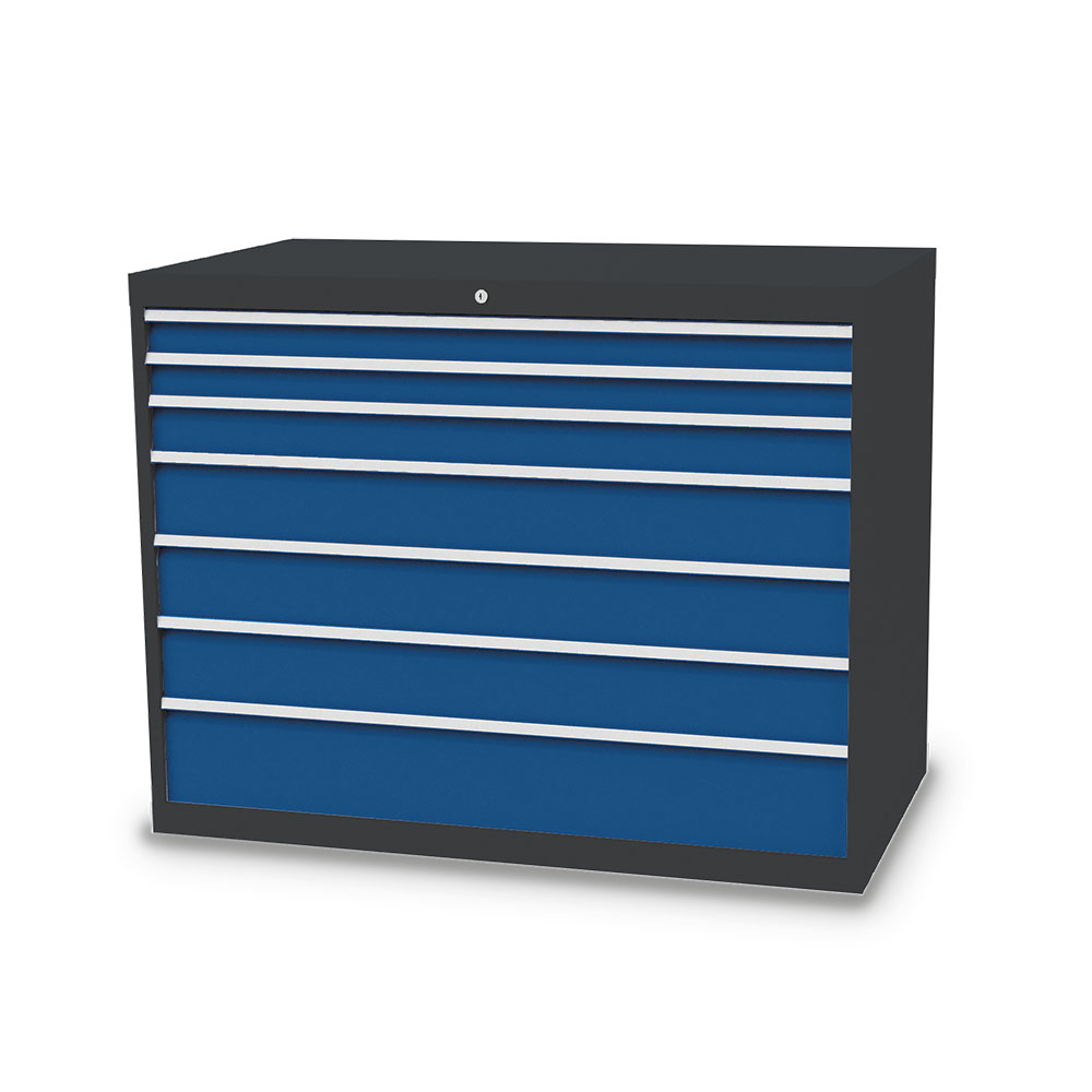 Dieser Schubladenschrank ist echt made in Germany. Stabiles Gehäuse aus verschweißtem Stahlblech. 7 x Schubladen mit Vollauszug 100%. Erhöhte Kippsicherheit durch Schubladen-Einzelauszug, nur eine Schublade kann geöffnet werden. Sichere Zentralverriegelung, diebstahlsicher.