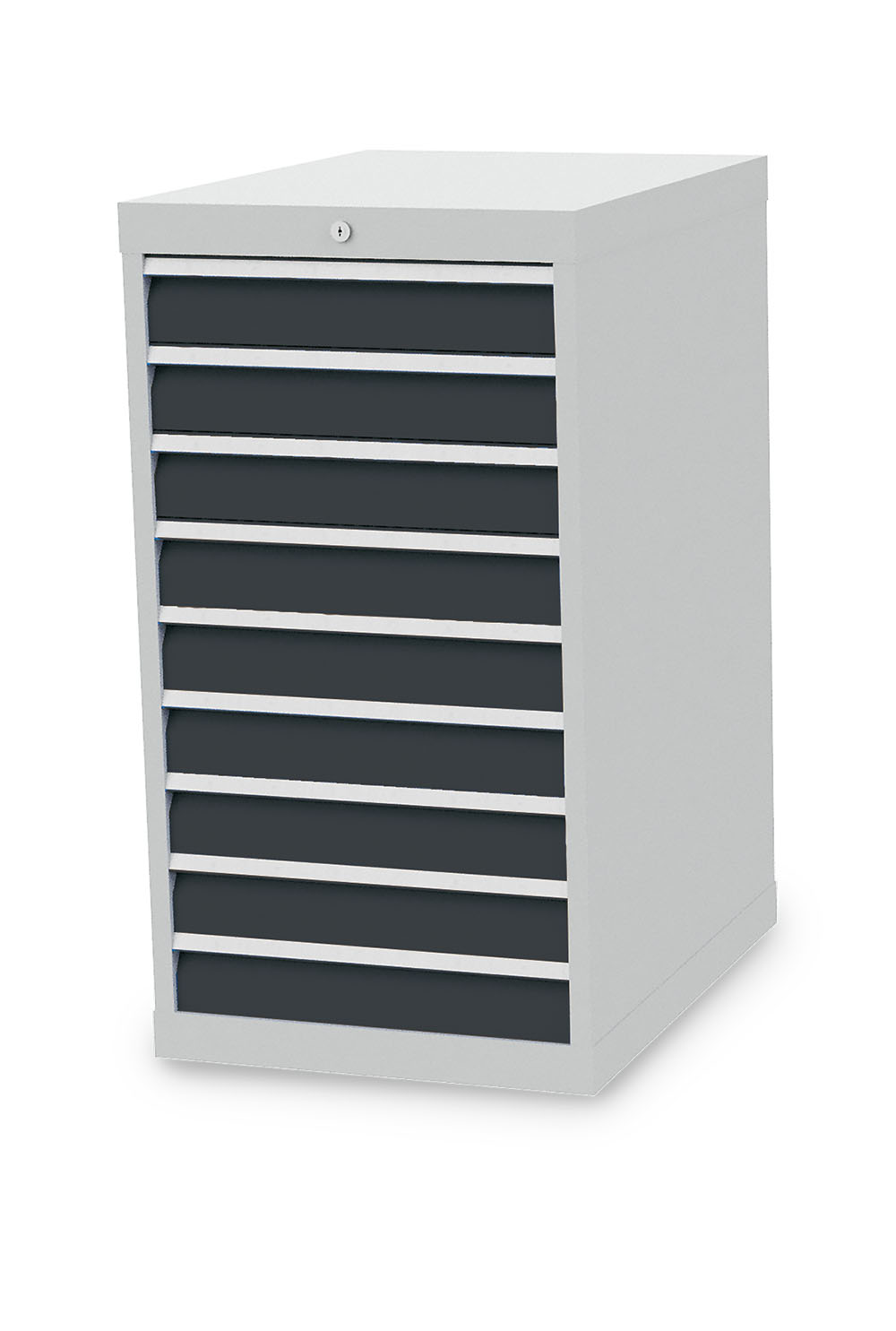 Dieser Schubladenschrank ist echt made in Germany. Stabiles Gehäuse aus verschweißtem Stahlblech. 9 x Schubladen mit Vollauszug 100%. Erhöhte Kippsicherheit durch Schubladen-Einzelauszug, nur eine Schublade kann geöffnet werden. Sichere Zentralverriegelung, diebstahlsicher.