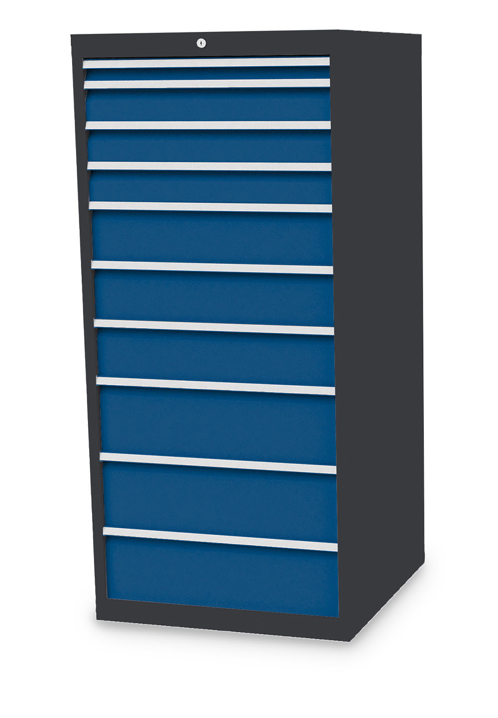 Dieser Schubladenschrank ist echt made in Germany. Stabiles Gehäuse aus verschweißtem Stahlblech. 10 x Schubladen mit Vollauszug 100%. Erhöhte Kippsicherheit durch Schubladen-Einzelauszug, nur eine Schublade kann geöffnet werden. Sichere Zentralverriegelung, diebstahlsicher.