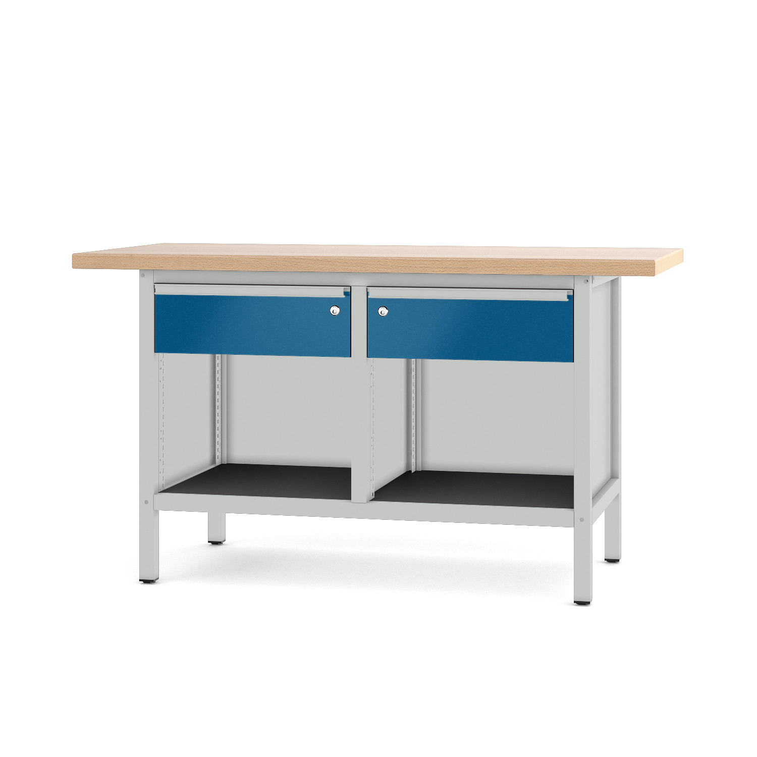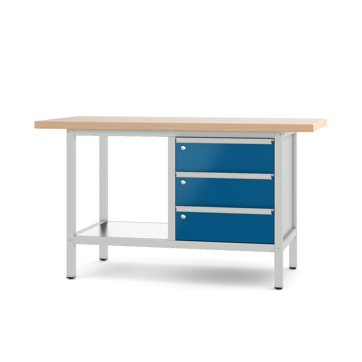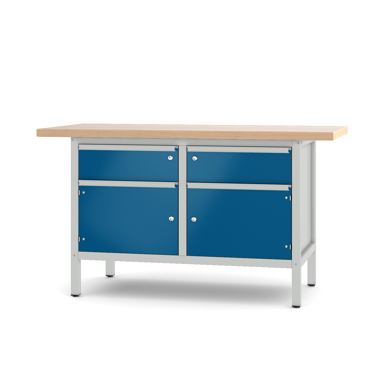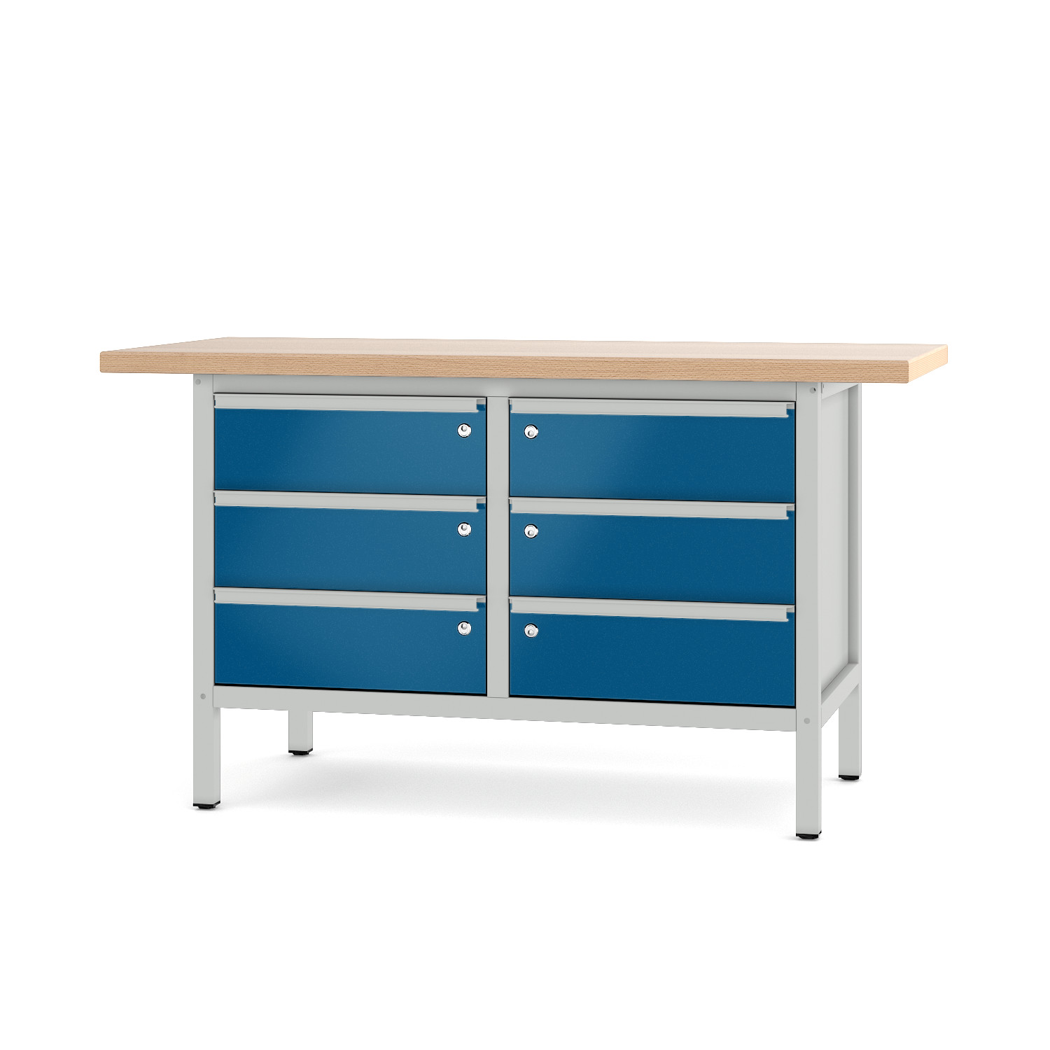 Werkbank Typ 21 S 32 Eine Werkbank mit vielen Möglichkeiten Die vier robusten Schubladen und die Tür aus Qualitätsblech bieten genügend Stauraum für Ihre Werkzeuge. Durch die Schweißkonstruktion und die Massiv-Leimholzplatte aus bestem Buchenholz können wir Ihnen Stabilität und Qualität - made in Germany - garantieren. Bis zu 1000 Kg hält der Profi unter den Werkbänken stand und passt sich Ihnen, mit einer Arbeitshöhe von 855 mm , optimal an. Sie können diese Werkbank, des Typs 21 S 32, direkt vom Hersteller in zwei Längen und verschiedensten Farben bestellen. Wenn Sie mehr Türen und weniger Schubladen suchen schauen Sie doch mal in der Baureihe 2 vorbei. Die Werkbank 21 S 32 auf einen Blick: bestehend aus: 1 System-Gestell Gr. I, 1 Tür rechts, 3 Schublade links und 1 Schublade rechts System-Gestell: Stabile Schweißkonstruktion aus Profilrohr 40 x 40 x 2,0 mmL 1170 x T 605 x H 815 mmmit oben und unten einmontierten Tiefenverstrebungenmit Kunststoff-Höhenausgleicher bis max. 20 mm. Flächenlast max. 1000 Kg Arbeitshöhe 855 mm Buche-Massiv-Leimholzplatte L 1500/2000 mm x T 700 mm, 40 mm stark Oberfläche geschliffe, Korn 100geölt widerstandsfähig und robust höchst belastbar mehrfach abschleifbar hohe Lebensdauer Schublade aus verz. QualitätsblechInnenmaß B 490 x T 460 mmAuszug: 98%, Tragkraft: 70,0 Kg, Einzelschließung Tür aus Qualitätsblechmit selbstauszuziehenden Scharnieren180° Öffnungsweite Ablageböden aus verz. Stahlblech Systemgestell und nicht verzinkten Blechteile: als Vorbehandlung eisenphosphatiert und pulverbeschichtet Lieferung komplett montiert Sie möchten zusätzliche Informationen zu der technischen Beschreibung? Dann schauen Sie sich unsere Bildübersicht "Qualität bis ins Detail" an!