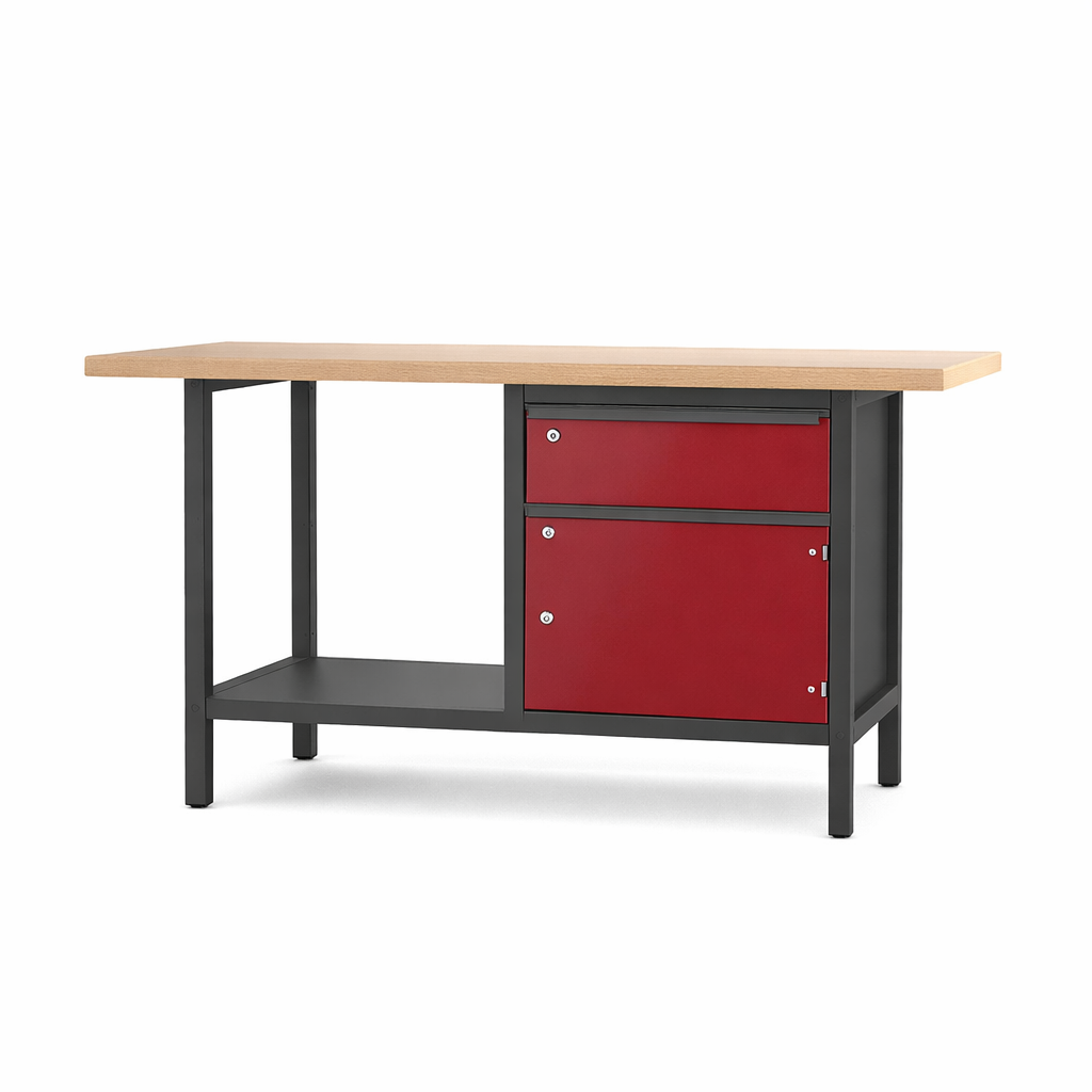In der raffinierten Schublade können Sie geschickt Ihr Werkzeug verstauen und hinter der Tür große Gerätschaften verstecken. Durch den Ablageboden haben Sie Ihr Arbeitsmaterial immer griffbereit. Als echter Profi hält die Werkbank des Typs 21 S 02 Lasten von bis zu 1000 Kg stand und an der Massiv-Leimholzplatte lässt es sich bequem arbeiten. Die Schweißkonstruktion bringt nicht nur die nötige Stabilität und Qualität mit sich, sondern lässt sich auch farblich nach Ihren Bedürfnissen anpassen. Sie erhalten die Werkbänke direkt vom Hersteller komplett montiert. Andere Variationen finden Sie in der Baureihe 2.