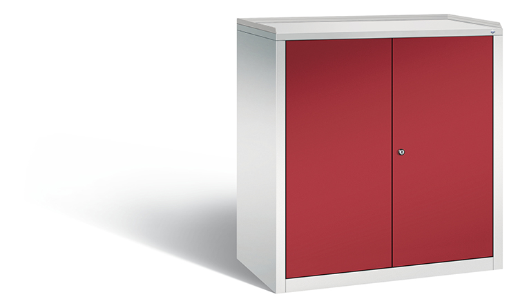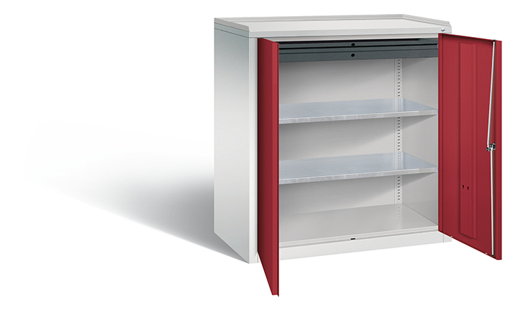 Korpus aus stabiler Stahlkonstruktion mit hochwertiger Einbrennbeschichtung für hohe UV-Beständigkeit, oben mit Gummiriefenmatte und 3-seitiger Aufkantung als praktische Abrollsicherung, mit Kunststoffgleitern als praktischer Schrank- und Fußbodenschutz, hohe Flexibilität der Inneneinrichtung durch Höhenverstellbarkeit im 15 mm Raster, Türen verstärkt für hohe Stabilität, Türaufhängung in Drehbolzen mit Öffnungswinkel ca. 110 Grad, zueinanderschlagend für gemeinsamen Verschluss