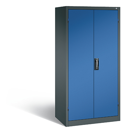 Korpus aus stabiler Stahlkonstruktion mit hochwertiger Einbrennbeschichtung für hohe UV-Beständigkeit, mit Kunststoffgleitern als praktischer Schrank- und Fußbodenschutz, hohe Flexibilität der Inneneinrichtung durch Höhenverstellbarkeit im 15 mm Raster, Türen verstärkt für hohe Stabilität und verdeckten Schließstangen, Türaufhängung in außen liegenden Scharnieren mit großzügigem Öffnungswinkel ca. 180 Grad, zueinanderschlagend für gemeinsamen Verschluss