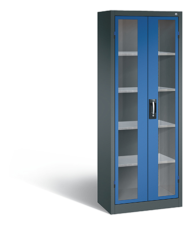 Korpus aus stabiler Stahlkonstruktion mit hochwertiger Einbrennbeschichtung für hohe UV-Beständigkeit, mit Kunststoffgleitern als praktischer Schrank- und Fußbodenschutz, hohe Flexibilität der Inneneinrichtung durch Höhenverstellbarkeit im 15 mm Raster, Türen mit geschlossenen Seitenprofilen und verdeckten Schließstangen für höchste Stabilität und Einbruchsicherheit, mit Sichtfenster aus Acrylglas für direkten Einblick, Türaufhängung in außen liegenden Scharnieren mit großzügigem Öffnungswinkel ca. 180 Grad, zueinanderschlagend für gemeinsamen Verschluss