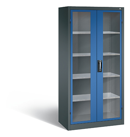 Korpus aus stabiler Stahlkonstruktion mit hochwertiger Einbrennbeschichtung für hohe UV-Beständigkeit, mit Kunststoffgleitern als praktischer Schrank- und Fußbodenschutz, hohe Flexibilität der Inneneinrichtung durch Höhenverstellbarkeit im 15 mm Raster, Türen mit geschlossenen Seitenprofilen und verdeckten Schließstangen für höchste Stabilität und Einbruchsicherheit, mit Sichtfenster aus Acrylglas für direkten Einblick, Türaufhängung in außen liegenden Scharnieren mit großzügigem Öffnungswinkel ca. 180 Grad, zueinanderschlagend für gemeinsamen Verschluss