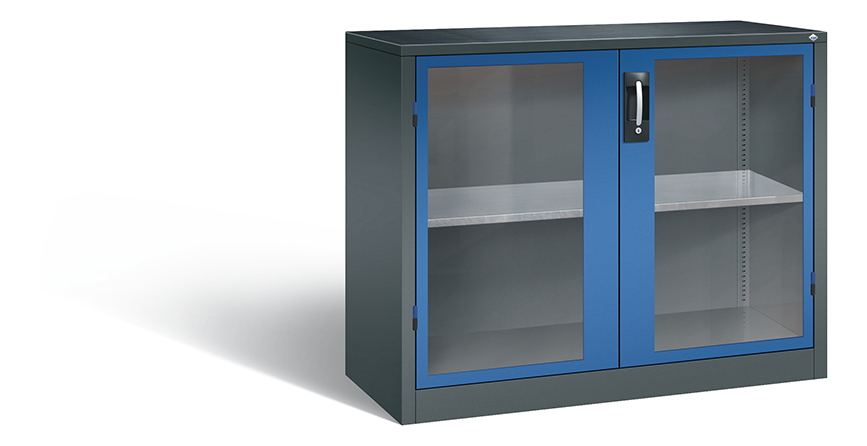 Korpus aus stabiler Stahlkonstruktion mit hochwertiger Einbrennbeschichtung für hohe UV-Beständigkeit, oben mit Gummiriefenmatte, mit Kunststoffgleitern als praktischer Schrank- und Fußbodenschutz, hohe Flexibilität der Inneneinrichtung durch Höhenverstellbarkeit im 15 mm Raster, Türen mit geschlossenen Seitenprofilen und verdeckten Schließstangen für höchste Stabilität und Einbruchsicherheit, mit Sichtfenster aus Acrylglas für direkten Einblick, Türaufhängung in außen liegenden Scharnieren mit großzügigem Öffnungswinkel ca. 180 Grad, zueinanderschlagend für gemeinsamen Verschluss