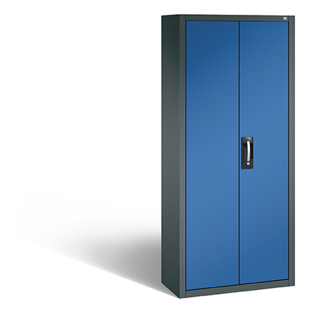 Korpus aus stabiler Stahlkonstruktion mit hochwertiger Einbrennbeschichtung für hohe UV-Beständigkeit, mit Kunststoffgleitern als praktischer Schrank- und Fußbodenschutz, hohe Flexibilität der Inneneinrichtung durch Höhenverstellbarkeit im 10 mm Raster, Türen verstärkt für hohe Stabilität, Türaufhängung oben und unten in Drehbolzen mit Öffnungswinkel ca. 110 Grad, zueinanderschlagend für gemeinsamen Verschluss