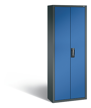 Korpus aus stabiler Stahlkonstruktion mit hochwertiger Einbrennbeschichtung für hohe UV-Beständigkeit, mit Kunststoffgleitern als praktischer Schrank- und Fußbodenschutz, hohe Flexibilität der Inneneinrichtung durch Höhenverstellbarkeit im 10 mm Raster, Türen verstärkt für hohe Stabilität, Türaufhängung oben und unten in Drehbolzen mit Öffnungswinkel ca. 110 Grad, zueinanderschlagend für gemeinsamen Verschluss