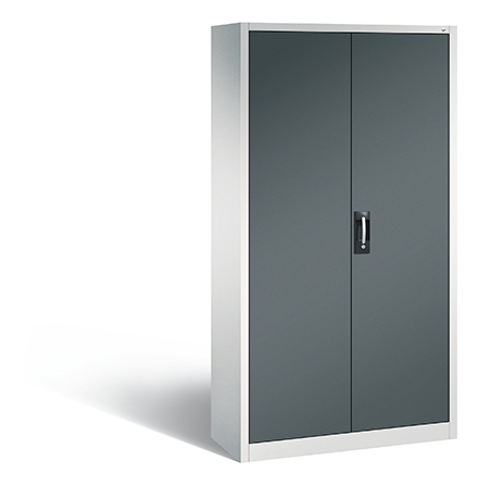 Korpus aus stabiler Stahlkonstruktion mit hochwertiger Einbrennbeschichtung für hohe UV-Beständigkeit, mit Kunststoffgleitern als praktischer Schrank- und Fußbodenschutz, hohe Flexibilität der Inneneinrichtung durch Höhenverstellbarkeit im 10 mm Raster, Türen verstärkt für hohe Stabilität, Türaufhängung oben und unten in Drehbolzen mit Öffnungswinkel ca. 110 Grad, zueinanderschlagend für gemeinsamen Verschluss