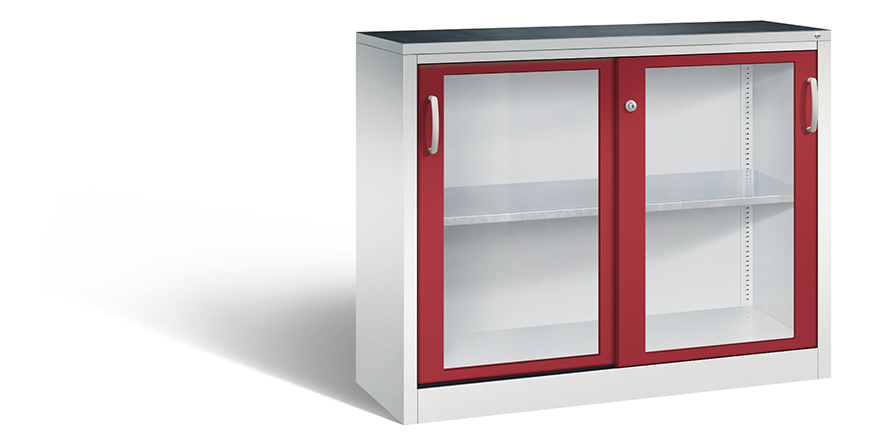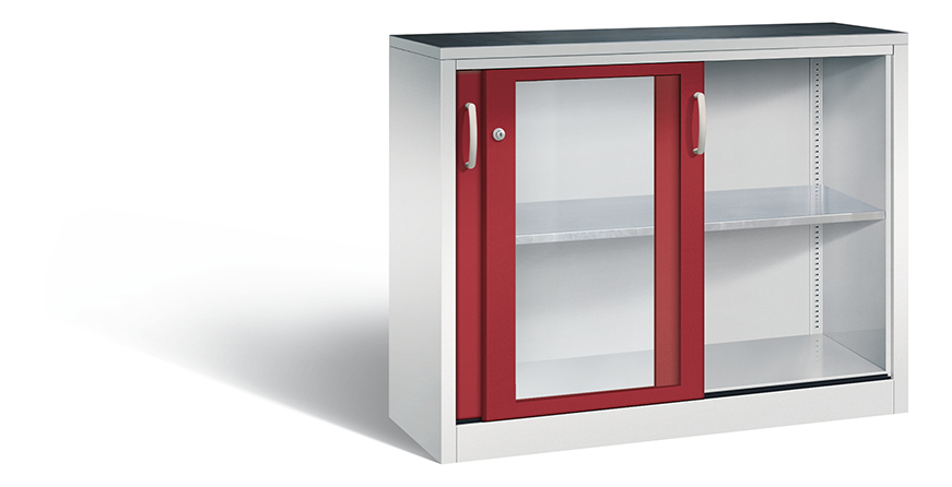 Korpus aus stabiler Stahlkonstruktion mit hochwertiger Einbrennbeschichtung für hohe UV-Beständigkeit, mit Kunststoffgleitern als praktischer Schrank- und Fußbodenschutz, hohe Flexibilität der Inneneinrichtung durch Höhenverstellbarkeit im 15 mm Raster, Türen mit Sichtfenster aus Acrylglas für direkten Einblick