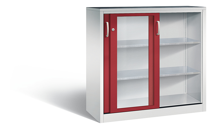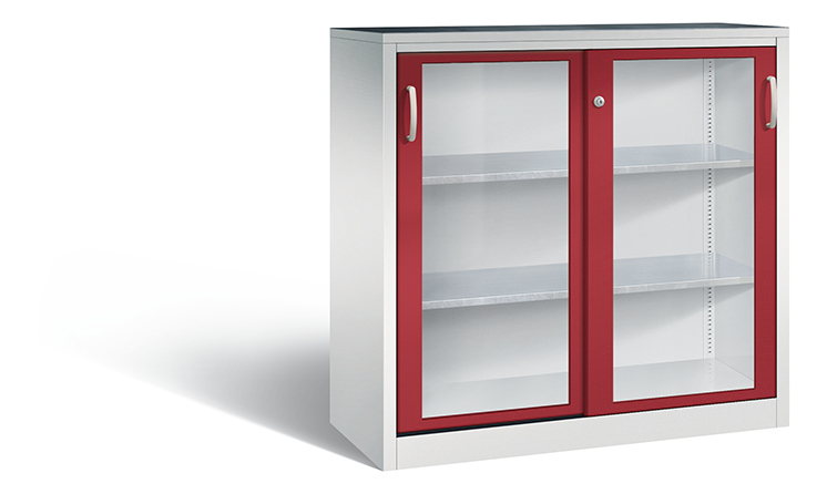 Korpus aus stabiler Stahlkonstruktion mit hochwertiger Einbrennbeschichtung für hohe UV-Beständigkeit, mit Kunststoffgleitern als praktischer Schrank- und Fußbodenschutz, hohe Flexibilität der Inneneinrichtung durch Höhenverstellbarkeit im 15 mm Raster, Türen mit Sichtfenster aus Acrylglas für direkten Einblick