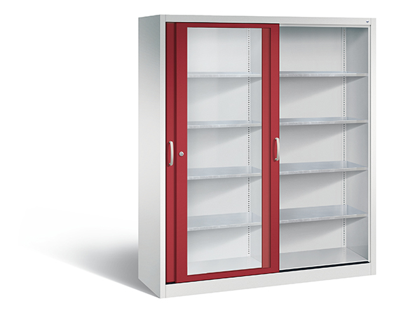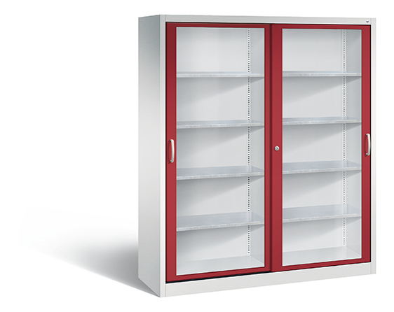 Korpus aus stabiler Stahlkonstruktion mit hochwertiger Einbrennbeschichtung für hohe UV-Beständigkeit, mit Kunststoffgleitern als praktischer Schrank- und Fußbodenschutz, hohe Flexibilität der Inneneinrichtung durch Höhenverstellbarkeit im 15 mm Raster, Türen mit Sichtfenster aus Acrylglas für direkten Einblick