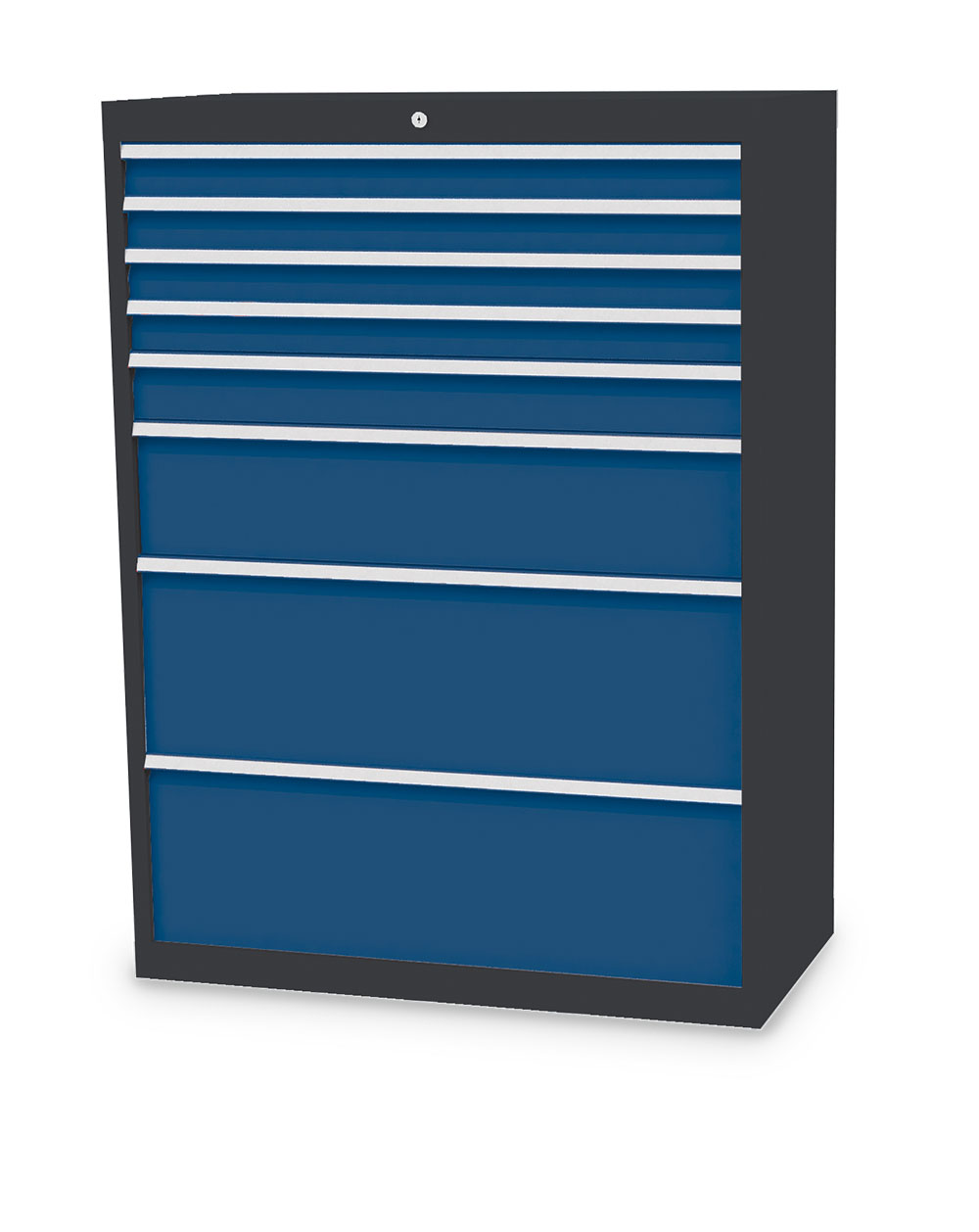 Dieser Schubladenschrank ist echt made in Germany. Stabiles Gehäuse aus verschweißtem Stahlblech. 8 x Schubladen mit Vollauszug 100%. Erhöhte Kippsicherheit durch Schubladen-Einzelauszug, nur eine Schublade kann geöffnet werden. Sichere Zentralverriegelung, diebstahlsicher.