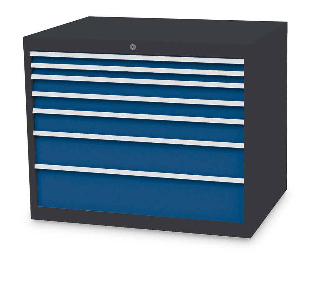 Dieser Schubladenschrank ist echt made in Germany. Stabiles Gehäuse aus verschweißtem Stahlblech. 7 x Schubladen mit Vollauszug 100%. Erhöhte Kippsicherheit durch Schubladen-Einzelauszug, nur eine Schublade kann geöffnet werden. Sichere Zentralverriegelung, diebstahlsicher.