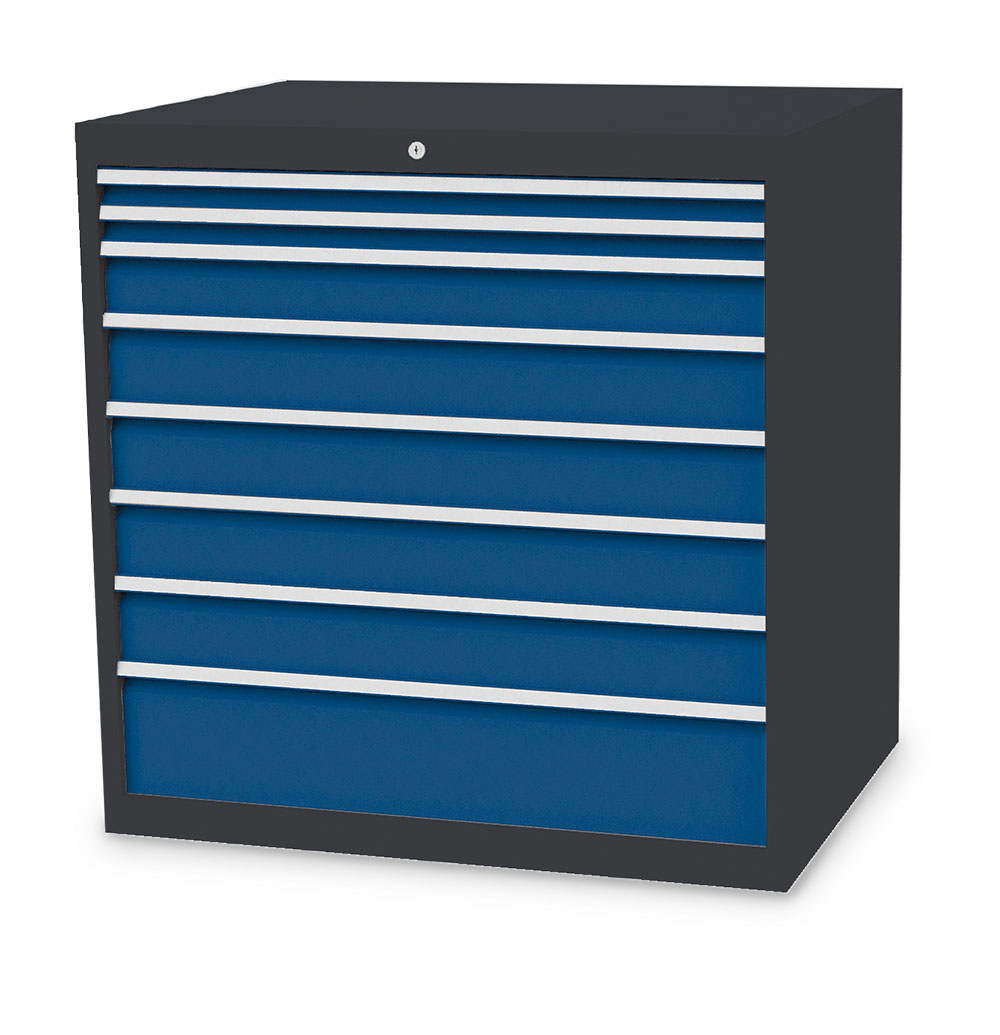 Dieser Schubladenschrank ist echt made in Germany. Stabiles Gehäuse aus verschweißtem Stahlblech. 8 x Schubladen mit Vollauszug 100%. Erhöhte Kippsicherheit durch Schubladen-Einzelauszug, nur eine Schublade kann geöffnet werden. Sichere Zentralverriegelung, diebstahlsicher.