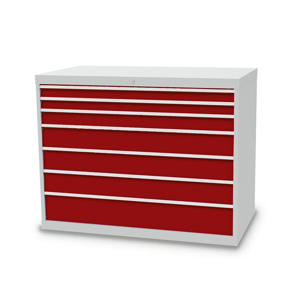 Dieser Schubladenschrank ist echt made in Germany. Stabiles Gehäuse aus verschweißtem Stahlblech. 7 x Schubladen mit Vollauszug 100%. Erhöhte Kippsicherheit durch Schubladen-Einzelauszug, nur eine Schublade kann geöffnet werden. Sichere Zentralverriegelung, diebstahlsicher.
