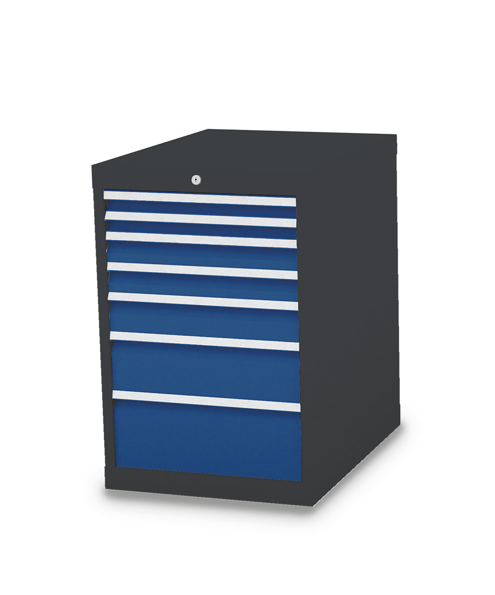 Dieser Schubladenschrank ist echt made in Germany. Stabiles Gehäuse aus verschweißtem Stahlblech. 7 x Schubladen mit Vollauszug 100%. Erhöhte Kippsicherheit durch Schubladen-Einzelauszug, nur eine Schublade kann geöffnet werden. Sichere Zentralverriegelung, diebstahlsicher.