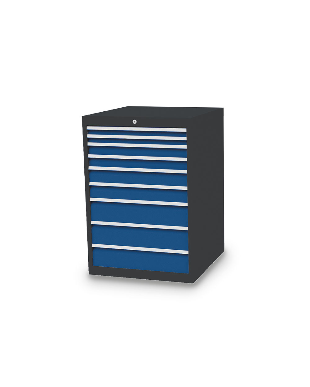 Dieser Schubladenschrank ist echt made in Germany. Stabiles Gehäuse aus verschweißtem Stahlblech. 9 x Schubladen mit Vollauszug 100%. Erhöhte Kippsicherheit durch Schubladen-Einzelauszug, nur eine Schublade kann geöffnet werden. Sichere Zentralverriegelung, diebstahlsicher.