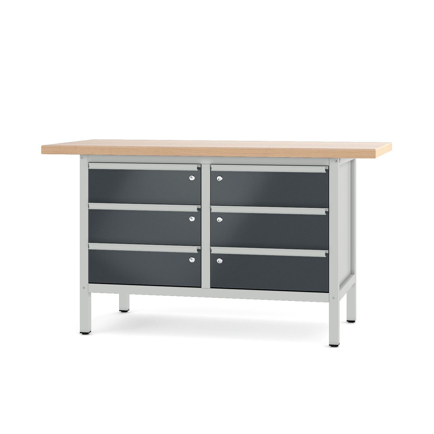 Wenn Sie viel Werkzeug zu verstauen haben, werden Sie diese Werkbank des Typs 21 S 33 mögen. In den insgesamt sechs Schubladen lassen Sie Ihre Arbeitsgeräte geschickt verschwinden. Passend zur Betriebseinrichtung können Sie die Werkbänke von Pador durch verschiedenste Farbkombinationen anpassen. Sie erhalten das Modell direkt vom Hersteller komplett montiert in Ihren Betrieb geliefert und können direkt mit der Arbeit starten. Mit einer Traglast von bis zu 1000 Kg hält die stabile Schweißkonstruktion und Massiv-Leimholzplatte auch großem Druck stand. Andere Varianten dieses Modells finden Sie in der Baureihe 2.