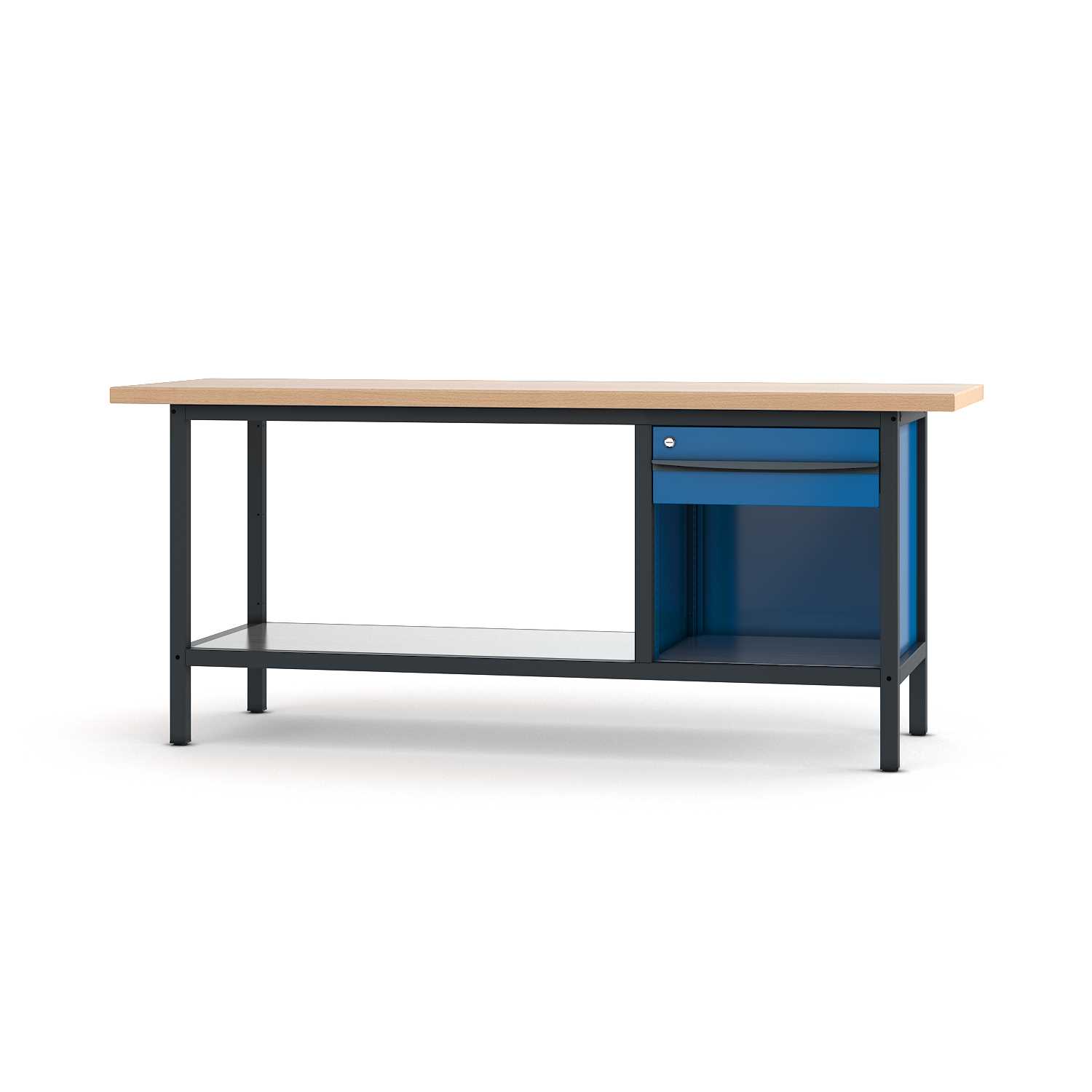 Diese hochwertige Werkbank - made in Germany - hat viel zu bieten. Sie besteht aus dem System-Gestell Größe III mit jeweils einem offenen Fach links und in der Mitte, dazu rechts eine praktische Schublade. Ein Arbeitstisch auf dem Ihr Werkzeug einen Platz findet. Die Massiv-Leimholzplatte aus Buche wird von einer stabilen Schweißkonstruktion gehalten und bietet mit einer Arbeitsfläche von 2000 x 700 mm genügend Raum, um sich zu entfalten. Die Schubladen aus verzinktem Qualitätsbleck verfügen über eine kugelgelagerte Rollenführung und einen Auszugsstopp, damit Ihre Utensilien sicher lagern. Weitere Werkbänke dieser Art finden Sie unter der Baureihe 3.