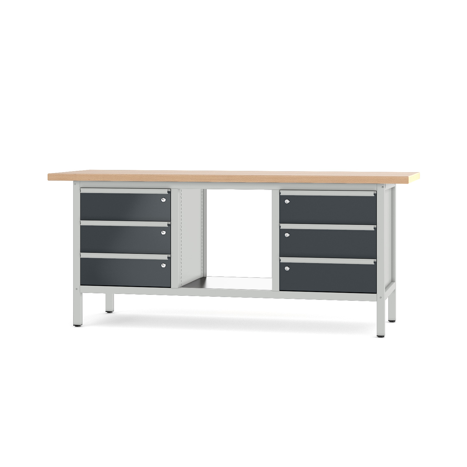 Stilvolles Arbeiten ist mit dieser Werkbank von Pador möglich. Sie können sich die Farbkombination selbst zusammenstellen, damit diese auch zu Ihrer Betriebseinrichtung passt. Die insgesamt sechs Schubladen bieten viel Stauraum für Ihr Werkzeug an. Wegen der kugelgelagerten Rollenführung mit Auszugsstopp ist die Bedienung federleicht. Die qualitätsvolle Massiv-Leimholzplatte, aus hellem Buchenholz, verbindet sich wunderbar mit der stabilen Schweißkonstruktion. Die Qualitativ hochwertige Werkbank des Typs 31 S 303 wird Ihnen den Arbeitsalltag erleichtern, durch ihre Traglast von bis zu 1000 Kg und der angenehmen Arbeitshöhe von 855 mm. In der Baureihe 3 finden Sie weitere Arbeitstische dieser Art.