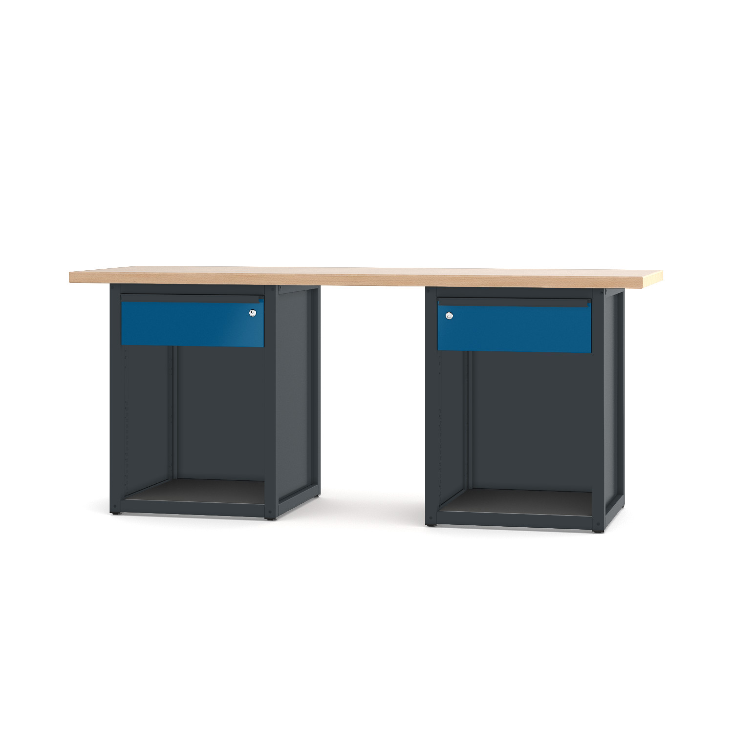 Ob groß oder klein, jedes Werkzeug lässt sich hier gut verstauen. Die praktischen Schubladen und großen Ablageböden bringen Ordnung in Ihren Betrieb. Die Massiv-Leimholzplatte aus heller Buche schließt die stabile Schweißkonstruktion perfekt ab und wird zu einem Design-Highlight in der Betriebsstätte. Diese Werkbank ist in vielen verschiedenen Farben und Kombinationen erhältlich. Die Werkbank des Typs 41 S 1.0.41 S 1 erhalten Sie komplett montiert direkt vom Hersteller, damit Zeit für Ihre Arbeit haben. Mit einer Tragkraft von bis zu 1000 Kg ist der Arbeitstisch ein echtes Lastentier und die Arbeitshöhe von 855 mm ermöglicht ein angenehmes Arbeiten. Ihnen gefällt was Sie sehen? Dann schauen Sie sich doch einmal unsere Baureihe 4 mit Sockelschrank an.
